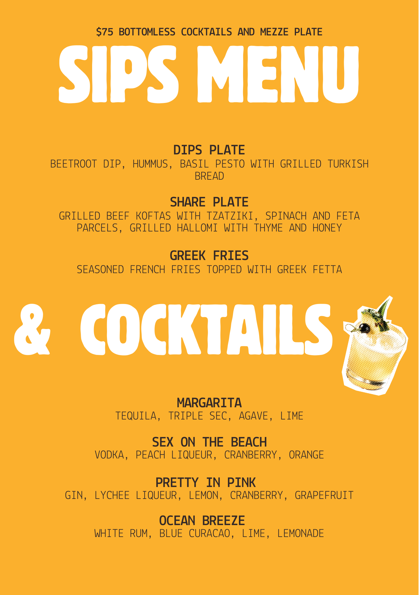 Every Friday and Saturday, guests can enjoy bottomless cocktails paired with a generous spread of mezze plates, skewers (meat or veggie), and dips for $75 per person (minimum of two people). It’s the ideal way to unwind, celebrate, or simply treat yourself. Book a table and make Sips & Snacks your new favourite weekend ritual.